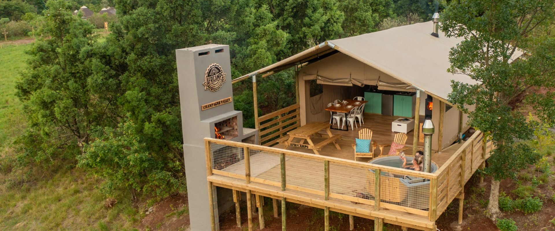 Situato nel cuore della Champagne Valley nel Central Drakensberg, l’AfriCamps Champagne Valley offre panorami montani spettacolari, aria frizzante e un soggiorno in tende glamping con molto più che solo i servizi di base. Questo boutique glamping ha diverse tende che possono ospitare fino a cinque persone e dispongono di due camere da letto, un camino interno, una angolo cucina e un bagno privato con una doccia grande. I terrazzi all’aperto di 30 metri quadrati sono dotati di un tavolo da picnic, lettini, un’area BBQ e una vasca idromassaggio riscaldata a legna… hai anche il Wi-Fi nella tua tenda per condividere quei tramonti rosa nella vasca! Con un piano cottura a quattro fuochi, un microonde e un frigorifero all’interno del tuo cottage, le vacanze con cucina autonoma sono un gioco da ragazzi!