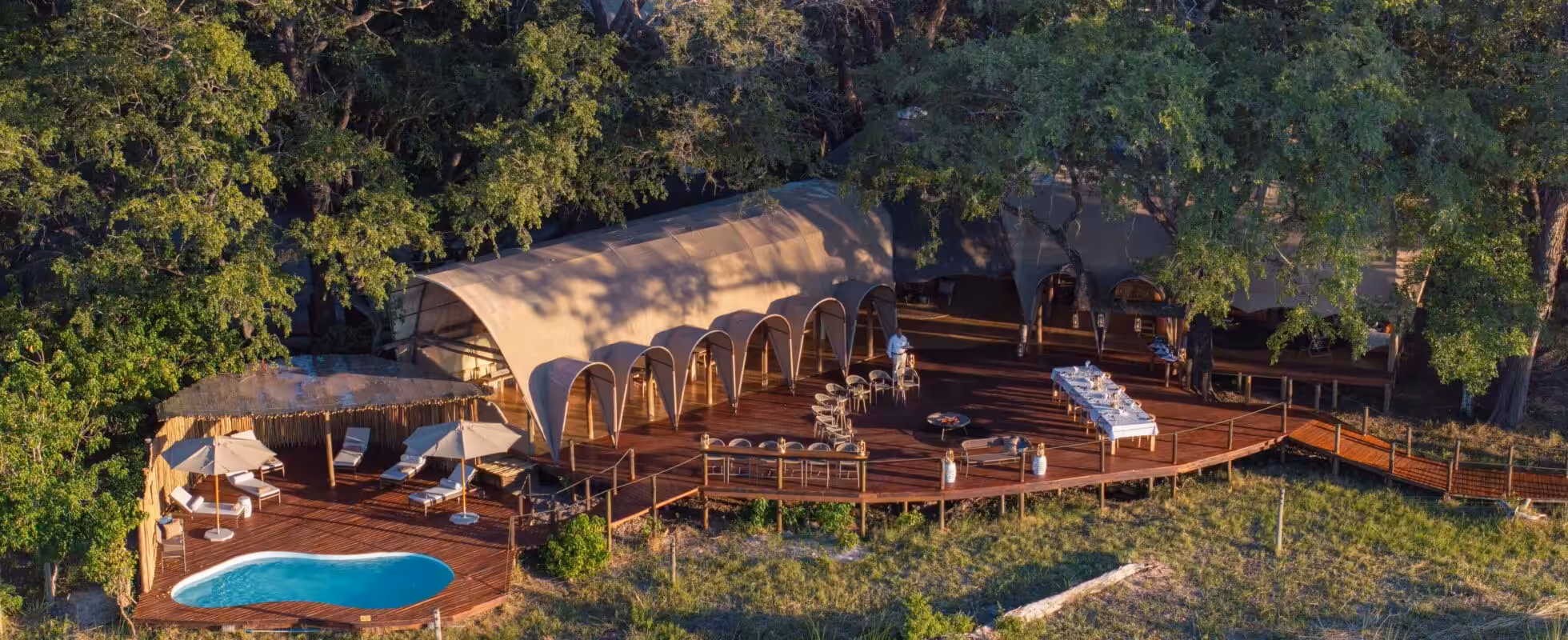 Camp Okuti lies along the Maunachira River in the Moremi Game Reserve’s Xakanaxa Lagoon, in the Okavango Delta’s northern stretches. Here, hippos often call just beyond the deck at sunrise, and the lagoon views stay wide open all day! The camp features five twin-bedded units and two family units, all raised on platforms with reed-and-canvas walls, featuring en-suite bathrooms with flush toilets and both indoor and outdoor showers (open to the sky for bird-watching mid-rinse!). A plunge pool offers a quick cool-down after hot afternoons, while meals are served in the dining area or under the stars in the open boma.