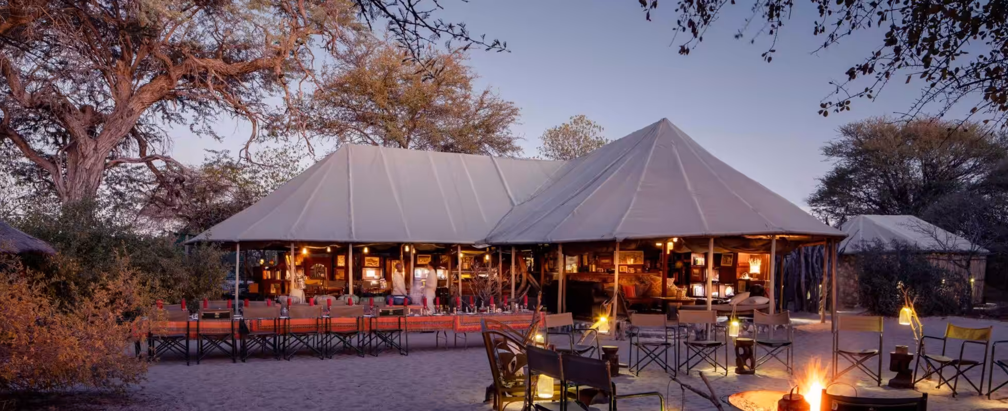 The Meno-a-Kwena Camp is ideally situated in the Makgadikgadi Pans, on the edge of a cliff with epic views of the Boteti River wildlife. Here, some of the best game viewing can be done from your tent’s private terrace. From their lofty position, 10 classic tents look down on a menagerie of animals at the water below, from herds of majestic elephant, to dazzles of nomadic zebra. They are decorated with colonial-style furniture and have fully-equipped ensuite bathrooms, with the authentic African shower. There are two family units, both with inter-leading tents (one with three beds for children, one with 2 beds). The camp has a natural rock plunge pool to cool off in between safari adventures, and a canvas lounge and dining tent where you can spend cosy evenings by the roaring camp fire, with your favourite nightcap.