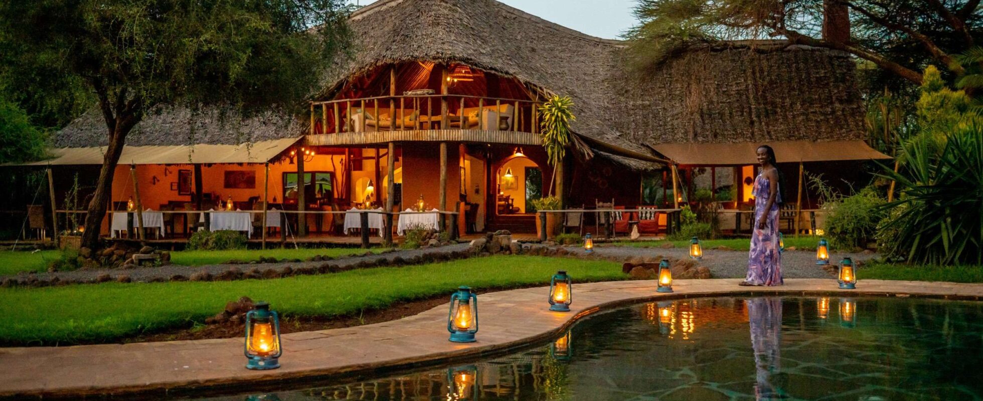 Il Tawi Lodge si trova su un terreno privato vicino all’ingresso Kimana Est del Parco Nazionale dell’Amboseli. Offre una vista splendida sul Monte Kilimangiaro in lontananza e su una pozza d’acqua dove ogni giorno vengono a bere elefanti, zebre, impala, kudu e gerenuk. Il lodge è arredato in uno stile moderno e confortevole, circondato da prati ben curati e un giardino rigoglioso, mentre dietro gli arbusti si intravedono elefanti che passano. Le camere sono decorate in legno scuro con pareti bianche sotto un tetto di palme intrecciate. I mobili sono massicci e pratici e le viste dalle terrazze delle camere sono semplicemente incredibili. L’area principale del lodge è spaziosa e include un ristorante, un bar, una lounge e un camino all’interno, e una piscina, una terrazza attrezzata e un area falò all’esterno. La cucina ama sperimentare e utilizza solo ingredienti freschi che diventano piatti incredibilmente gustosi, ispirati sia alla cucina europea che a quella swahili. Un posto incantevole!
