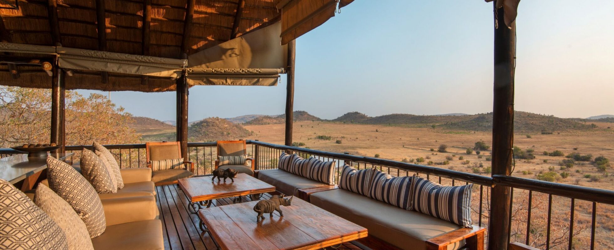 Il Tshukudu Bush Lodge si trova nel Parco Nazionale di Pilanesberg, famoso per i Big Five e una varietà di altre specie animali. Offre dieci chalet e suite di lusso incastonati su una collina rocciosa, ognuno con un letto matrimoniale, un patio privato e una vista spettacolare sul laghetto sottostante. I bagni privati presentano vasche incassate (la vista sulla boscaglia è incredibile!) e docce a pioggia. Altri servizi includono un sofà, un soggiorno open-space con camino e una piccola piscina con lettini prendisole, circondata da pareti di canne per una privacy ottimale. Preparati a delizie culinarie nella Dining Room, dove sono serviti colazione, high tea e cene di cinque portate, all’interno, sul patio o all’aperto sotto il cielo stellato! Il lodge accoglie bambini a partire da 12 anni.