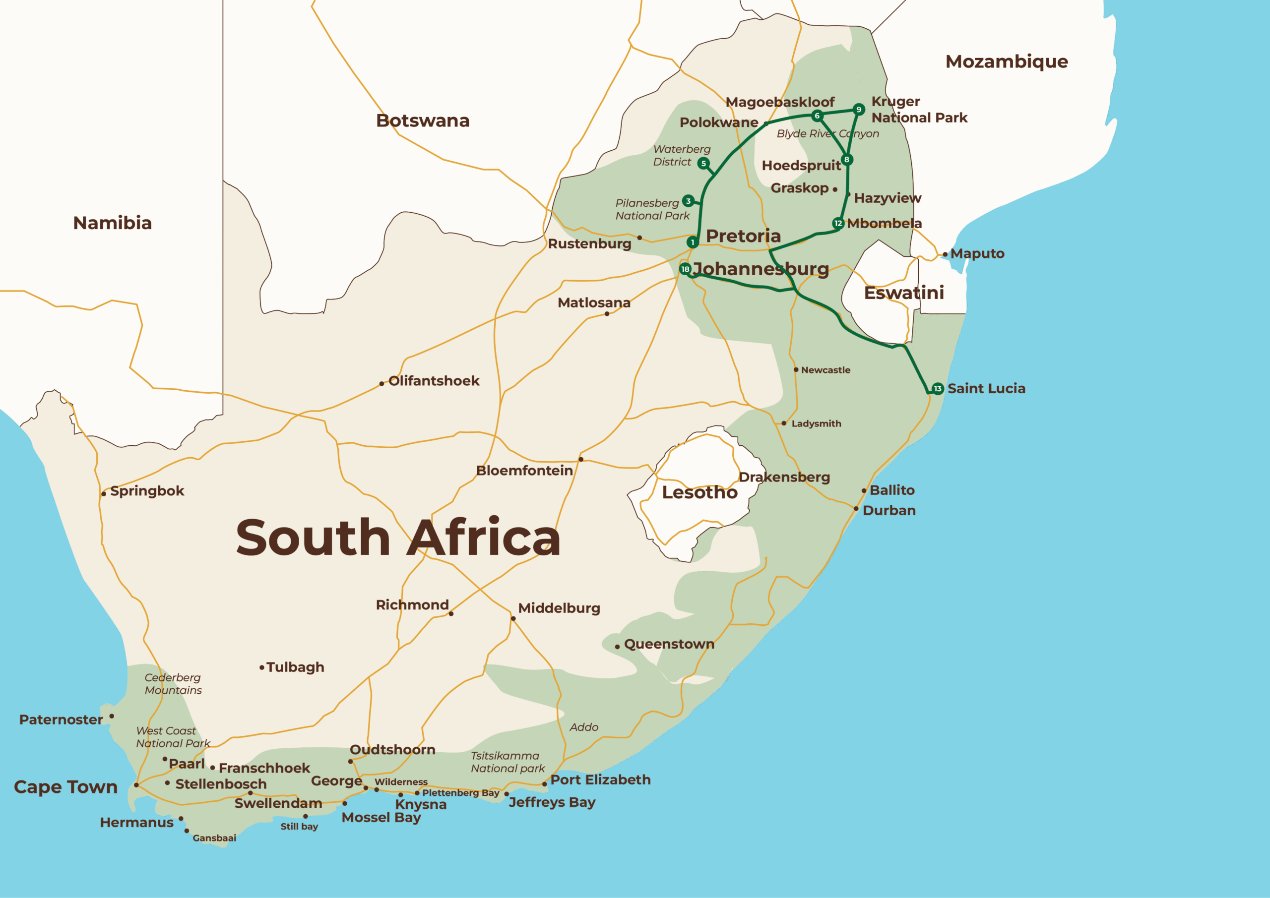 Nel Parco nazionale Kruger potrai immortalare i Big Five, gli Avian Six, 147 specie di mammiferi e 500 specie di uccelli. Quindi tieni pronta la fotocamera e non perderti scatti unici che lasceranno tutti a bocca aperta. Da qui, visita la città di Nelspruit, oggi ufficialmente chiamata Mbombela, dove troverai una flora spettacolare, ristoranti, grotte e molto altro.