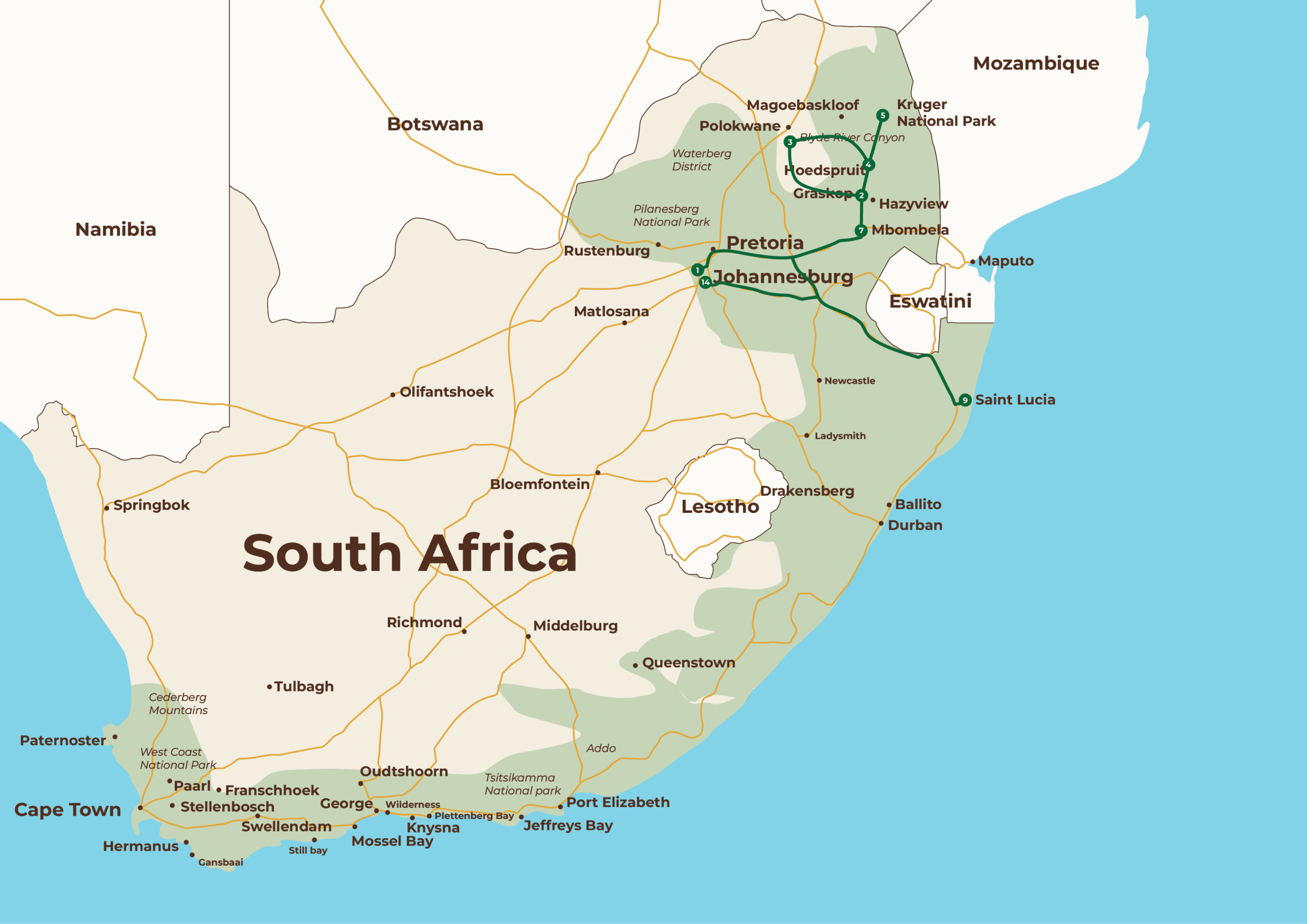 Questo itinerario è pensato per gli amanti degli animali. Incontra gli elefanti e Jessica l’ippopotamo a Elephant Whispers e osserva una straordinaria varietà di fauna nell’iSimangaliso Wetland Park, parco naturale e sito Patrimonio UNESCO. Poi, recati a Cape Vidal, celebre per le sue spiagge incontaminate e per lo snorkeling e le immersioni, e osserva pesci tropicali, tartarughe marine e una natura selvaggia ancora intatta. Naturalmente, non puoi perderti il Parco Nazionale Kruger, casa dei Big Five e di quasi tutto il cast de Il Re Leone, con ben 147 specie di mammiferi e oltre 500 specie di uccelli.