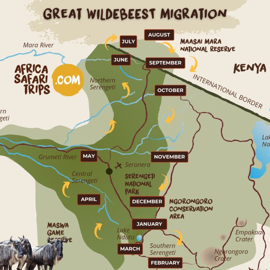 La Grande Migrazione degli gnu è un fenomeno naturale che non conosce confini. A partire da gennaio le mandrie si trovano nella parte meridionale del Parco Nazionale del Serengeti, in Tanzania. Seguendo le piogge (e le pianure erbose) verso nord, alla fine di luglio passano il confine con il Kenya. Qui migrano a migliaia nelle pianure del Masai Mara. Alla fine tornano a sud, oltrepassando il confine e rientrando nel Serengeti: una distanza totale di non meno di 800 km.